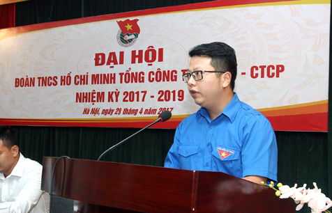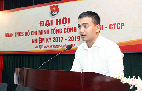 Phó Bí thư ĐTN TCTy Hoàng Như Thái trình bày báo cáo tổng kết công tác Đoàn và phong trào thanh niên nhiệm kỳ 2012 - 2017 và phương hướng nhiệm vụ nhiệm kỳ 2017 - 2019