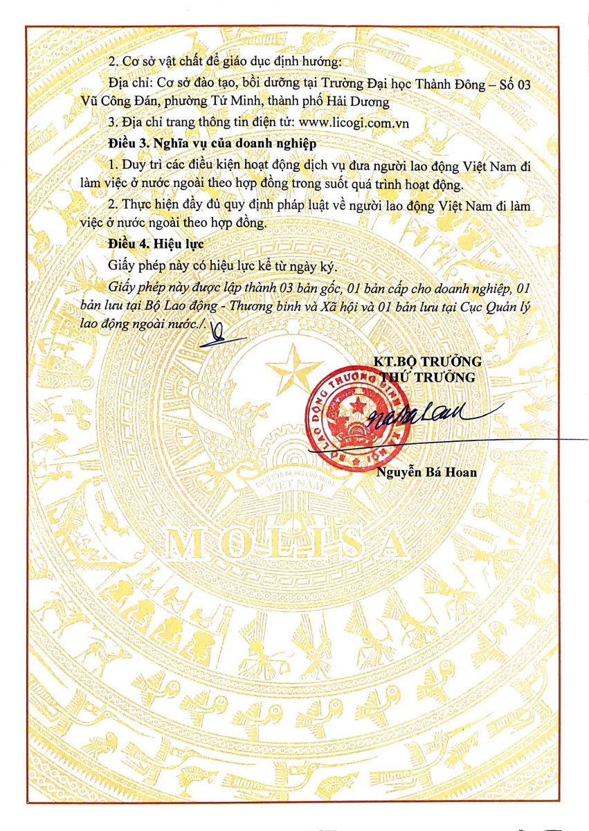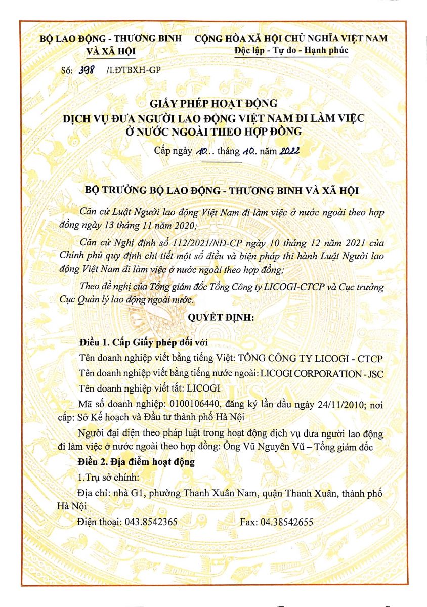 Ngày 10 tháng 10 năm 2022 Bộ lao động- Thương binh và xã hội đã cấp mới Giấy phép hoạt động dịch vụ đưa người lao động Việt Nam đi làm việc ở nước ngoài theo hợp đồng số 398/LĐTBXH-GP cho Tổng công ty LICOGI-CTCP.